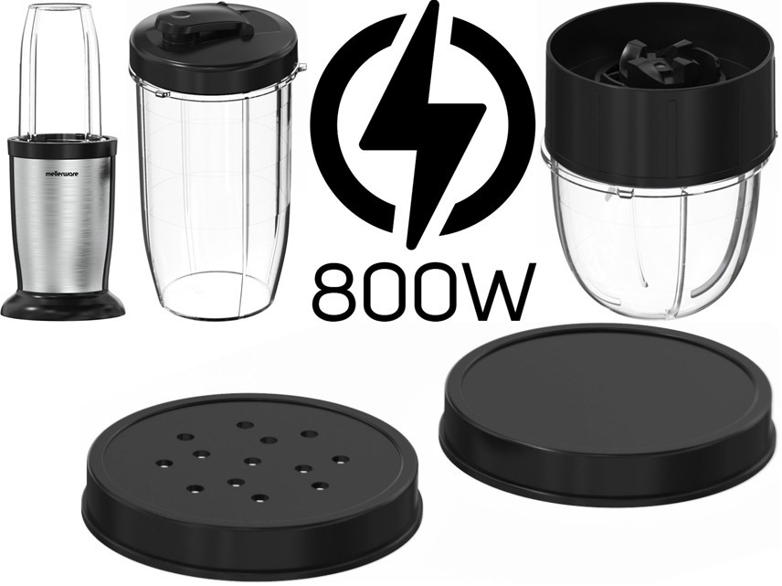 Mellerware Stainless Steel Personal Blender - 800W Power Nutriblast Blender, Plastic Body With Stainless Steel Housing, Pulse Function For Precise Blending, 2 x 500ml Food-grade Smoothie Cups, 2 x Flip-Top Lids, 6 Tip Blade With Ice-crush Function, 150ml Grinder Cup With 2-Tip Blade, Resealable Lid, Stainless Steel Blades For Durability, Retail Box, 1 Year Warranty.